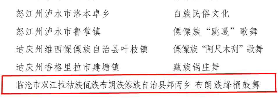 2009年,布朗族“蜂桶鼓舞”经国务院批准,被列入第二批国家级非物质文化遗产名录。特色鲜明的非遗艺术让双江拉祜族佤族布朗族傣族自治县邦丙乡(布朗族蜂桶鼓舞)被评选为2023—2025年度“云南民间文化艺术之乡” 。