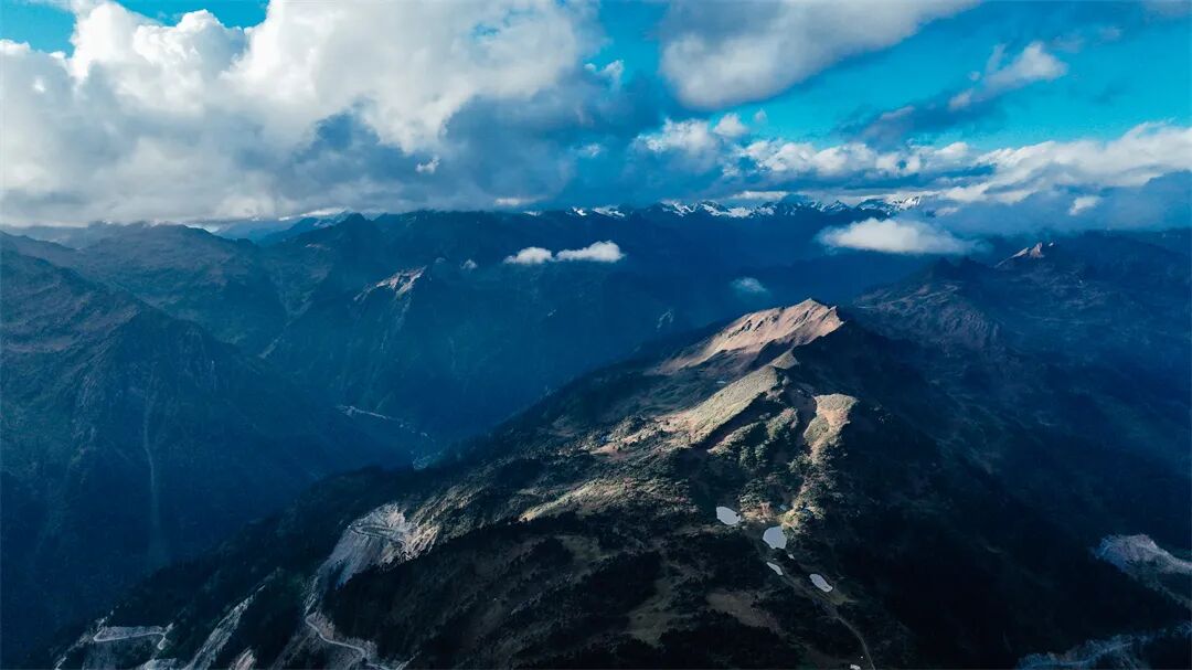 顺着老德贡公路来到海拔3882米的垭口,平视着孔雀山。从未这样近距离地到达高海拔山脉的山峰。夕阳斜照,山色温柔。好像顺着柔软的地衣,就能登上巅峰。无人机飞起,不同这面山坡的平缓,北面鞍背的岩层已风化严重。一步步走近,险峻的山势随暮色深浓而肃穆,大地之峰自有天地的威严。