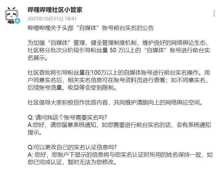 10月31日,微信、抖音、快手、微博、B站发布关于头部自媒体账号实名信息展示的公告。