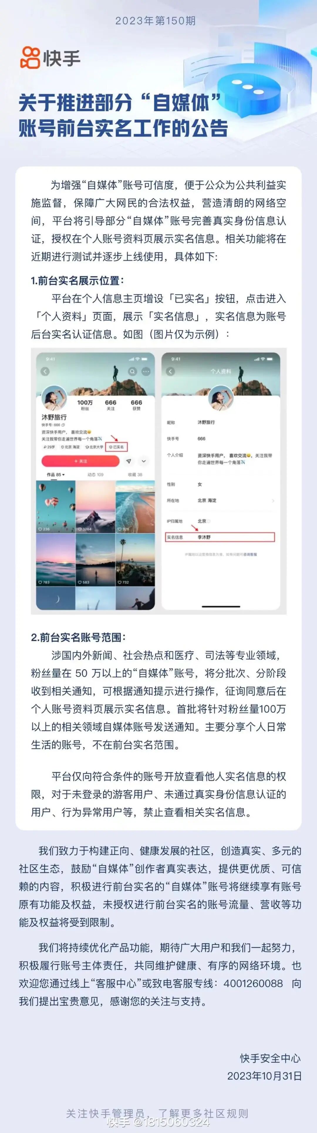 快手公告称,平台将引导部分“自媒体”账号完善真实身份信息认证,授权在个人账号资料页展示实名信息。相关功能将于近期进行测试并逐步上线使用。根据公告,前台实名账号范围为:涉国内外新闻、社会热点和医疗、司法等专业领域,粉丝量在50万以上的“自媒体”账号,将分批次、分阶段收到相关通知,可根据通知提示进行操作,征询同意后在个人账号资料页展示实名信息。快手表示,首批将针对粉丝量100万以上的相关领域自媒体账号发送通知。主要分享个人日常生活的账号,不在前台实名范围。