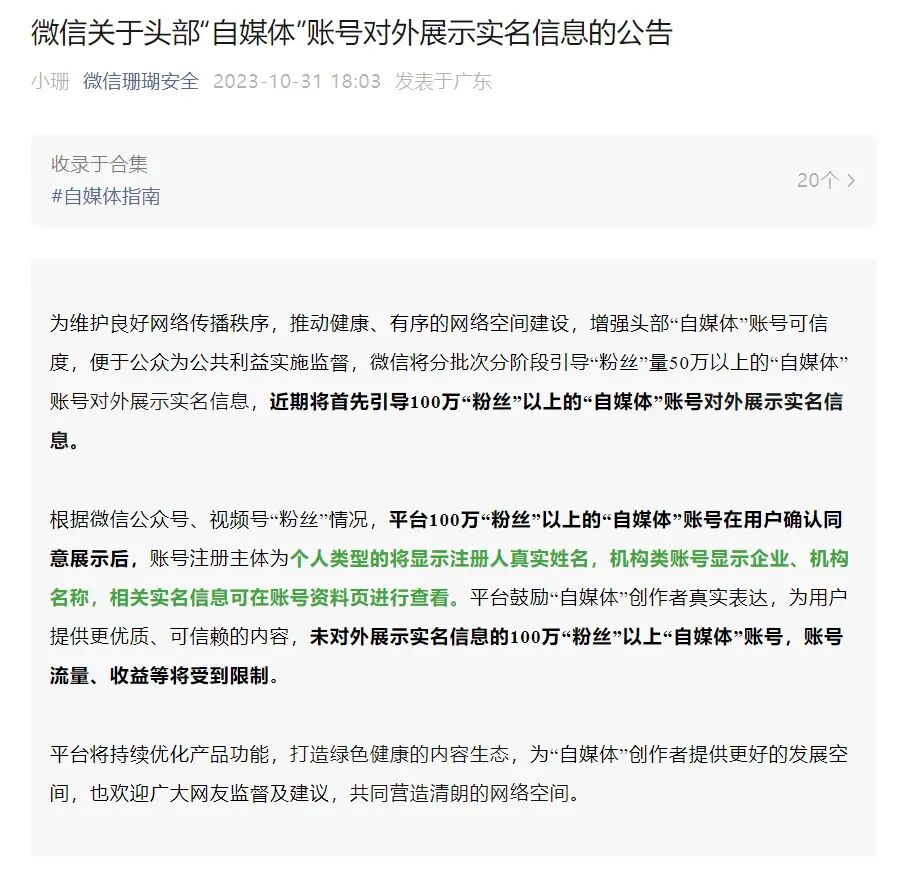 微信发布关于头部“自媒体”账号对外展示实名信息的公告称,将分批次分阶段引导“粉丝”量50万以上的“自媒体”账号对外展示实名信息,近期将首先引导100万“粉丝”以上的“自媒体”账号对外展示实名信息。