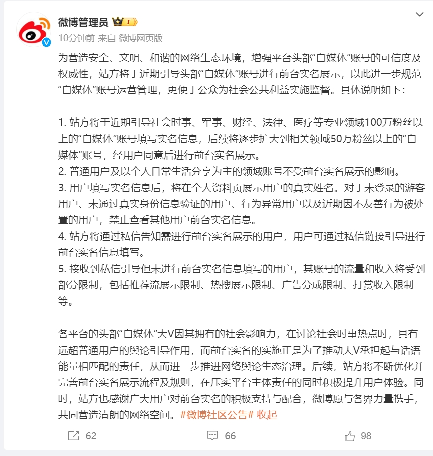 微博管理员发文称,为营造安全、文明、和谐的网络生态环境,增强平台头部“自媒体”账号的可信度及权威性,站方将于近期引导头部“自媒体”账号进行前台实名展示,以此进一步规范“自媒体”账号运营管理,更便于公众为社会公共利益实施监督。