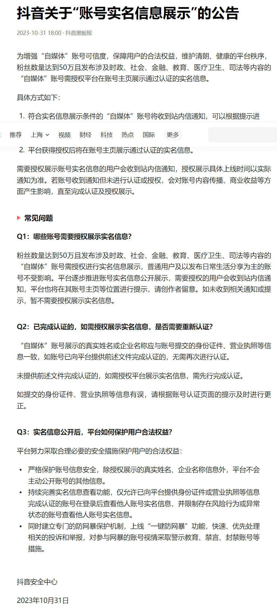 抖音发布关于“账号实名信息展示”的公告称,为增强“自媒体”账号可信度,保障用户的合法权益,维护清朗、健康的平台秩序,粉丝数量达到50万且发布涉及时政、社会、金融、教育、医疗卫生、司法等内容的“自媒体”账号需授权平台在账号主页展示通过认证的实名信息。