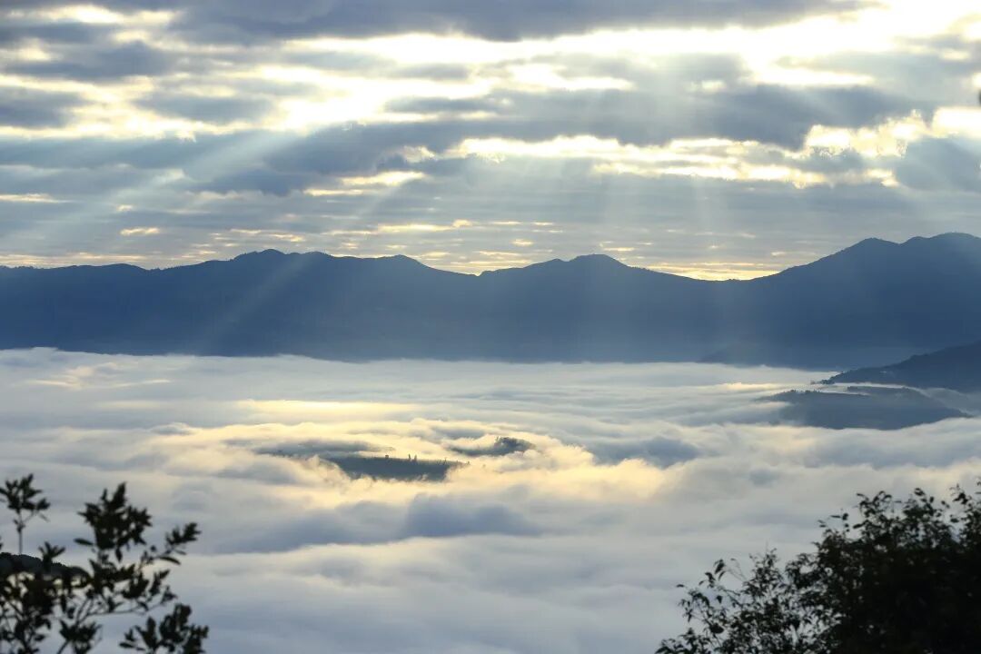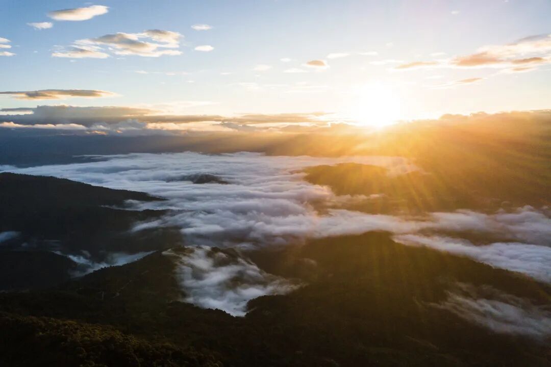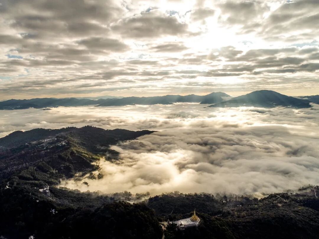 云海形成之初,水汽从奔腾的南朗河上升,云雾蒸腾间,不时有山峦与村落冒出来,其间又有古树披纱、翠绿氤氲,宛如世外桃源般遗世而独立。随着时间的推移,云层渐渐加厚,顺着山势缓缓蔓延,进而形成了翻滚的云浪。倘若云开雾散,便如惊鸿一瞥般显露出群峰叠翠、深谷幽涧,令人惊叹不已。