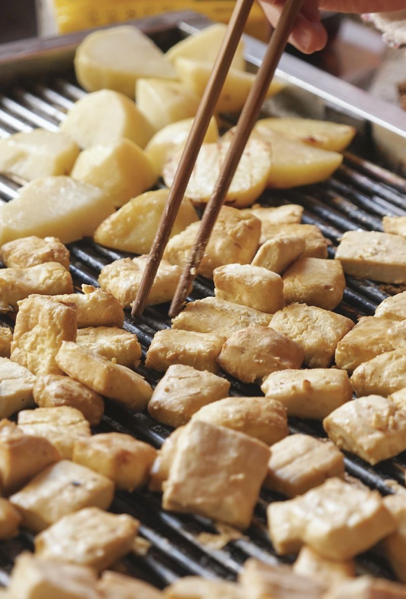 看着豆腐在炭火上翻滚
