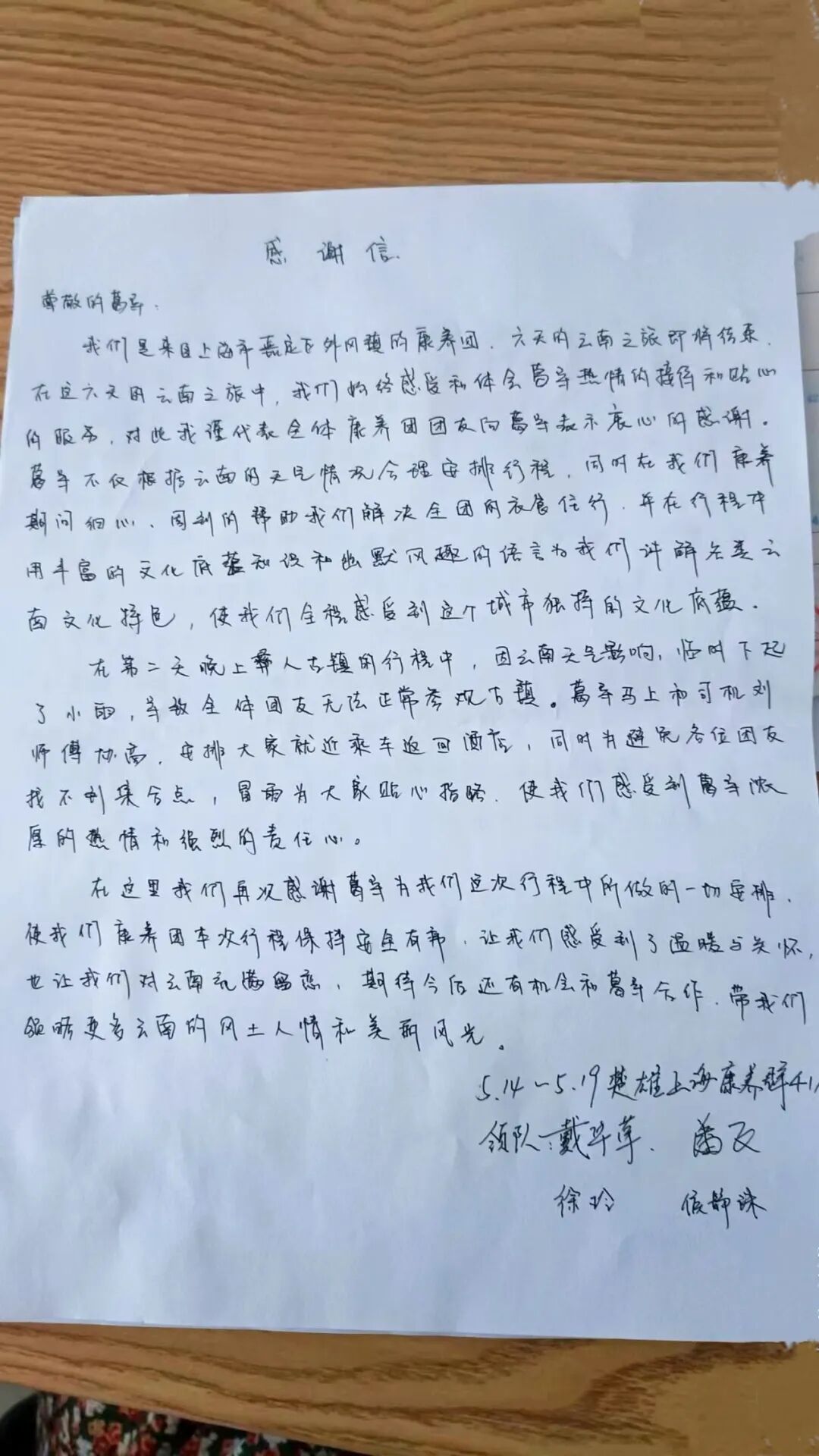 我们是来自上海市嘉定区外冈镇的康养团,六天的云南之旅即将结束,在这六天的云南之旅中,我们始终感受和体会着葛导的热情接待和贴心服务,对此我谨代表全体康养团团友向葛导表示衷心的感谢。葛导不仅根据云南的天气情况合理安排行程,同时在我们康养期间细心、周到的帮助我们解决全团的衣食住行,并在行程中用丰富的文化底蕴知识和幽默风趣的语言为我们讲解云南文化,使我们全程感受到这个城市独特的文化底蕴。