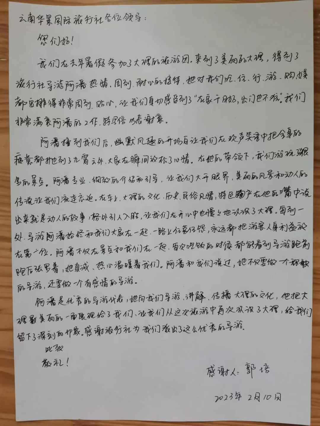 我们在去年暑假参加了大理的旅游团,来到了美丽的大理,得到了旅行社导游阿潘热情、耐心的接待,她对我们的吃、住、行、游、购、娱安排得非常周到、贴心,让我们真切感受到了“在家千日好,出门也不难。”我们非常满意阿潘的工作,特写信以表谢意。