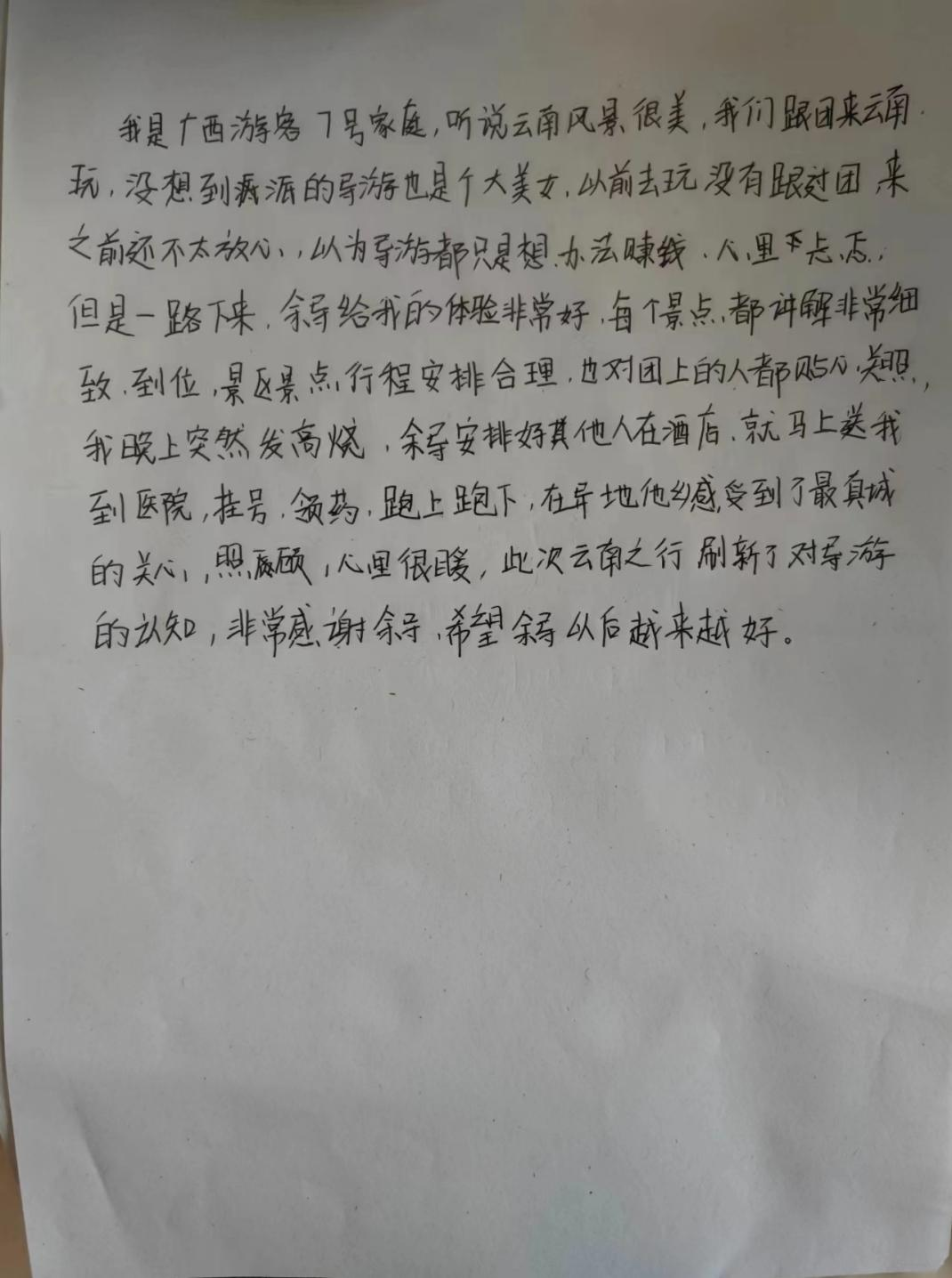 我是广西游客7号家庭,听说云南风景很美,我们跟团来云南玩,没想到派的导游也是个大美女,以前去玩没有跟过团,来之前还不太放心,以为导游都只是想办法赚钱,心里忐忑,但是一路下来,余导给我的体验非常好,每个景点讲解都非常细致、到位,景区景点行程安排合理,也对团上的人贴心关照,我晚上突然发高烧,余导安排好其他人入住酒店,就马上送我到医院,挂号、领药,跑上跑下,在异地他乡感受到了最真城的关心、照顾,心里很暖,此次云南之行刷新了对导游的认知,非常感谢余导,希望余导以后越来越好。