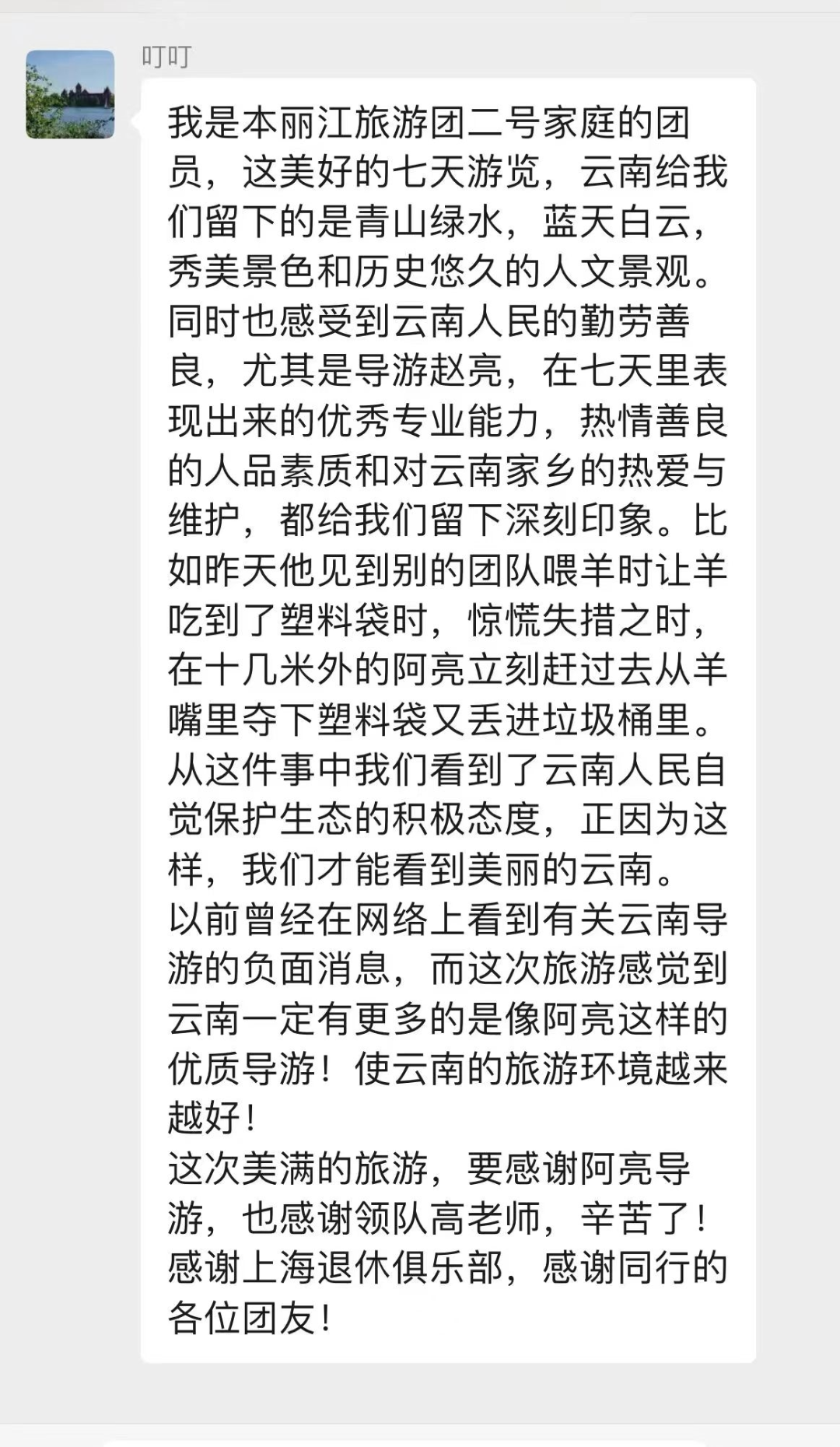 我是本次丽江旅游团二号家庭的团员,这美好的七天游览,云南给我们留下的是青山绿水,蓝天白云,秀美景色和历史悠久的人文景观。同时也感受到云南人民的勤劳善良,尤其是导游赵亮,在七天里表现出来的优秀专业能力,热情善良的人品素质和对云南家乡的热爱与维护,都给我们留下深刻印象。比如昨天他见到别的团队喂羊时,让羊吃到塑料袋惊慌失措时,在十几米外的阿亮立刻赶过去从羊嘴里夺下塑料袋又丢进垃圾桶里。从这件事中,我们看到了云南人民自觉保护生态的积极态度,正因为这样,我们才能看到美丽的云南。