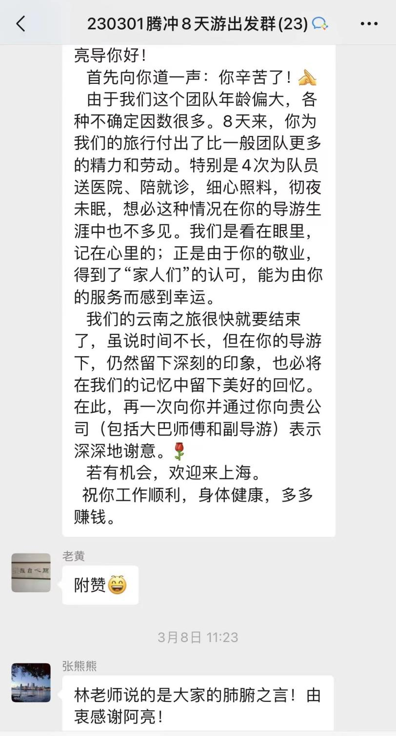 这次来云南旅游,非常荣幸碰到了阿亮这样认真负责的导游,虽然是第一次认识,但是从内心由衷地感叹一句:“认识你真好”。阿亮为人非常纯朴,但知识非常渊博,上至天文地理,下至风土人情,一一娓娓道来,真是才华出众。七天的陪伴,让我们不仅享受了旅游的快乐,更享受了人生的乐趣,更多的是你阿亮,传递给了我们信赖和踏实、真诚和善良,真是一次温馨的游程,使人难以忘怀。