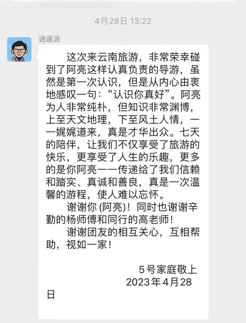 我们的云南之旅很快就要结束了,虽说时间不长,但在你的导游下,仍然留下深刻的印象,也必将在我们的记忆中留下美好的回忆。在此,再一次向你并通过你向贵公司(包括大巴师傅和副导游)表示深深地谢意!