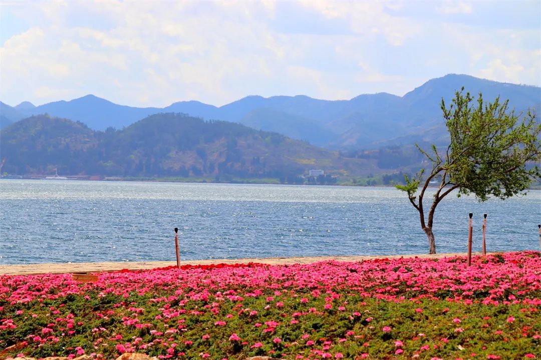 五颜六色的鲜花有序排列,勾勒出大片几何形状的花海,与抚仙湖无缝拼接。一边是波光粼粼、清澈见底的抚仙湖水,一边则是琳琅满目的花海铺满整个湖岸,入眼之处,皆是风景。
