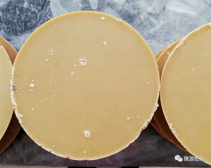 真正的漆油虽然是油,但是摸起来并不会有油腻感,而且成品油脂的颜色可分为蜡黄色与灰褐色两种。漆油外形块状如红糖,是怒江峡谷里野生漆树里漆籽榨出来的油,具有较高的营养价值。