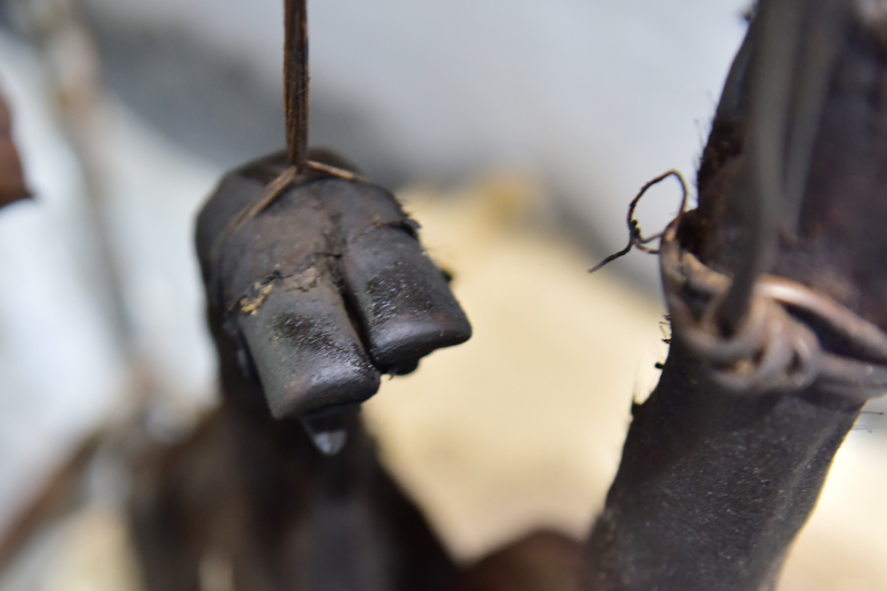 熏烤后的猪脚,放在屋内可存放数年,时间越久,肉的油脂越少,肉的香味越浓。老猪脚虽然表面有些发黑,但里面的肉依然与生肉颜色无二,色泽鲜艳,肉丝清晰。
