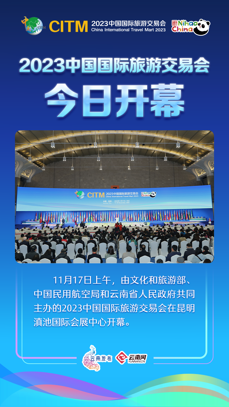 11月17日上午,由文化和旅游部、中国民用航空局和云南省人民政府共同主办的2023中国国际旅游交易会在昆明滇池国际会展中心开幕。