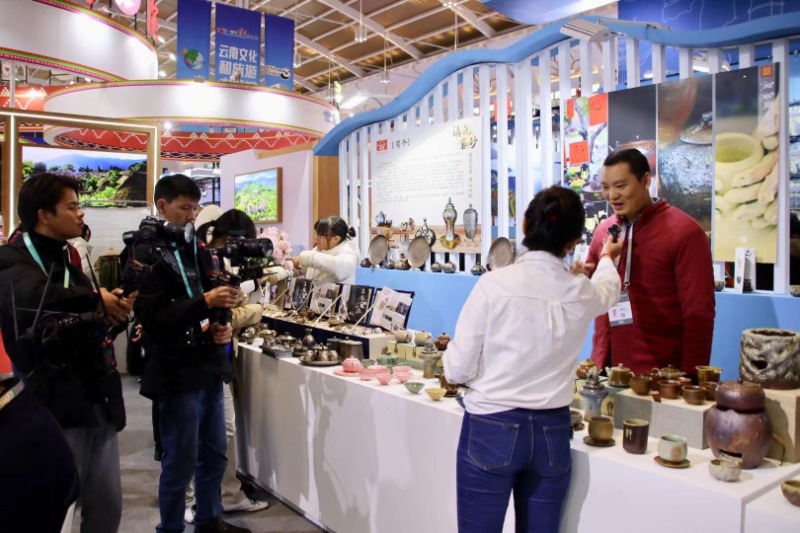 在宣传展销区,来往游客络绎不绝,玉溪集成旅行社、铂尔曼酒店、新平磨盘山国家森林公园、花腰傣开元森泊度假乐园等知名企业、酒店、景区积极推介各自的优质产品,得到了各地旅行商的肯定和青睐。尽心臻选的云溪陶、小龙茵刺绣、春喜铜、滇瓦紫砂、钢磨兽、斯贝佳、宁州陶、沁心陶艺、山里香等特色商品引得众多嘉宾和游客争相购买。