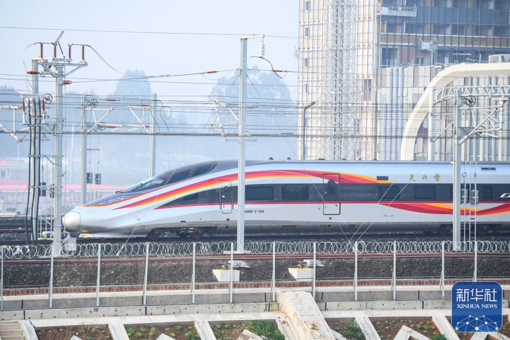 11月19日,试验列车55301次从成都东站驶出,标志着新建成都至宜宾高速铁路正式进入运行试验阶段。成都至宜宾高速铁路是四川省境内一条连接成都市、资阳市、内江市、自贡市与宜宾市的高速铁路,是国家“八纵八横”高速铁路网“京昆通道”的重要组成部分。(来源:新华社)