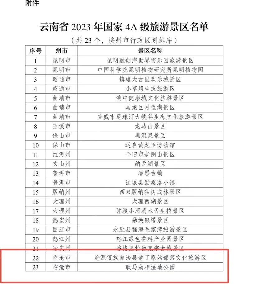 日前,云南省文化和旅游厅公布2023年云南省国家4A级旅游景区名单,临沧市沧源佤族自治县翁丁原始部落文化旅游区和耿马勐相湿地公园被评选为国家4A级旅游景区,占评定总数的十一分之一。
