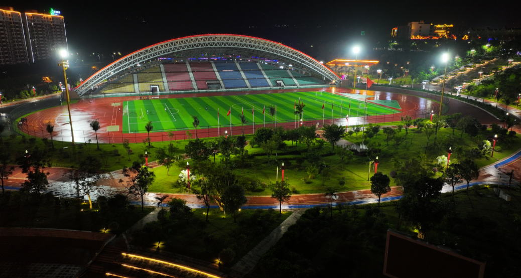 文体区:布局训练馆、展览馆、群艺馆和体育运动场(简称“三馆一场”),训练馆、展览馆、群艺馆通过连廊互联互通,主要功能为综合性文体活动场所。其中,体育馆建筑面积5454㎡,采用钢架结构,总跨度157.5米,阶梯式看台可同时容纳约4900余人观看比赛。
