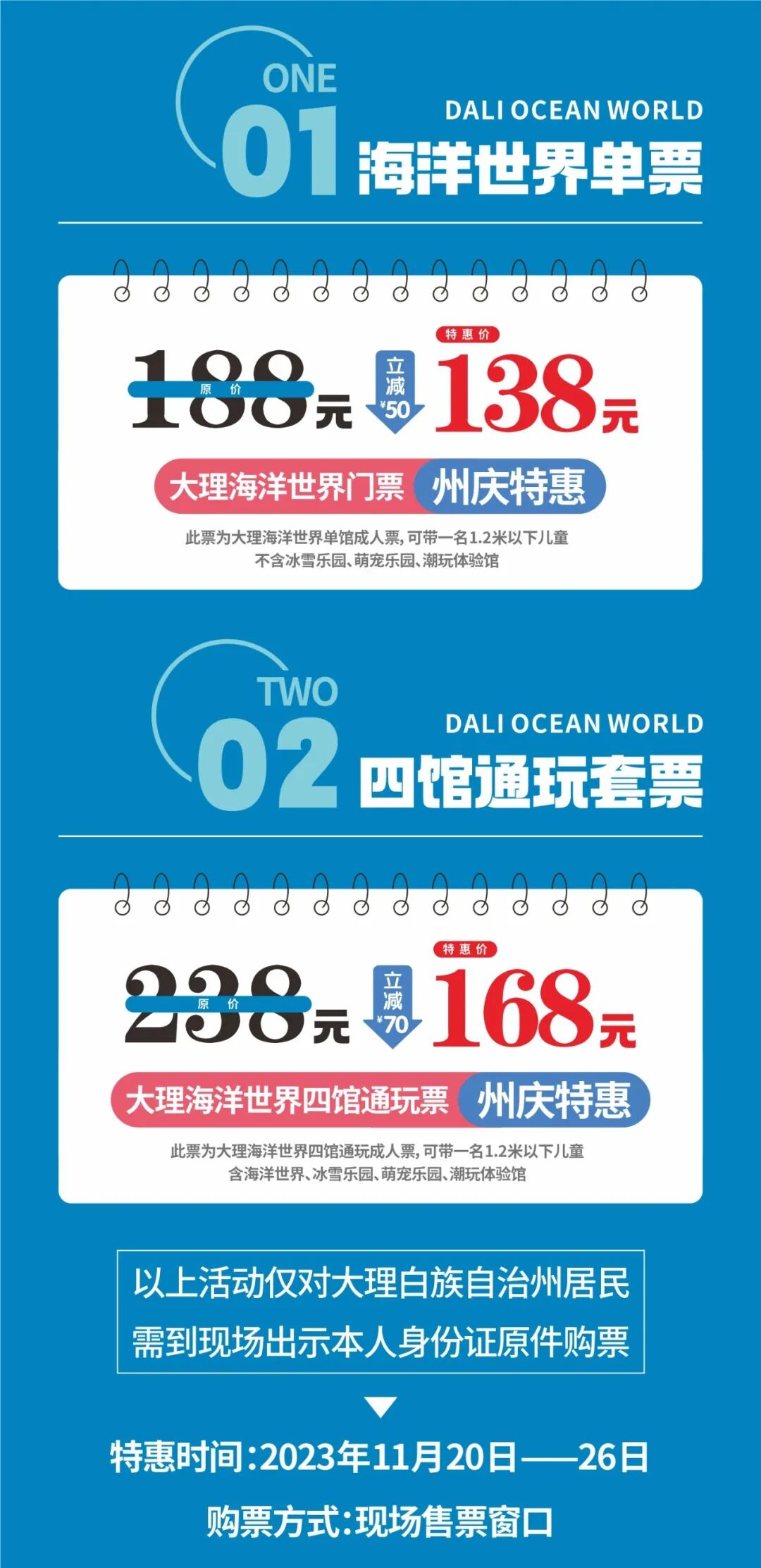 11月22日—11月26日,天龙八部冰雪大世界对大理州内居民实行39.8元/人票价优惠,大理州居民凭本人有效身份证兑票。