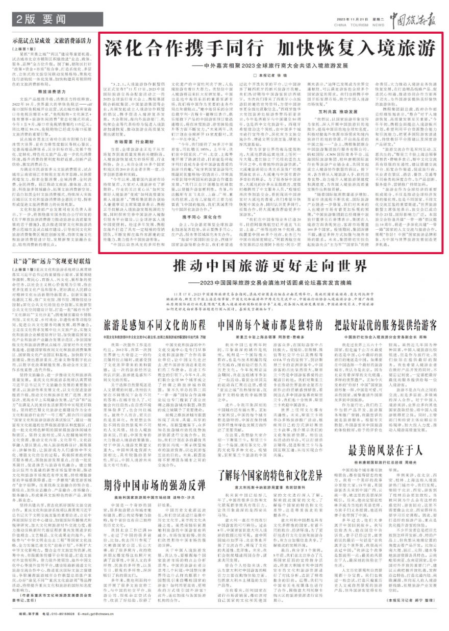 “随着国际航班数量逐步增加、签证申请流程不断优化、国际旅游产业链进一步修复,我们对未来的入出境游市场有着更加乐观的预期。”中国旅游集团副总经理兼中旅旅行董事长石善博表示,集团在入境游方面表现突出,客源市场覆盖100多个国家。疫情期间,集团深耕不辍,通过多种方式加强与境外市场的联系。未来,集团将切实担负起旅游央企“主力军”“国家队”的使命责任,大力推动入境游业务快速恢复发展,在打造精品线路产品、促进民心相通、推进协同合作方面再下功夫,为外国游客提供美好愉快的旅游体验。
