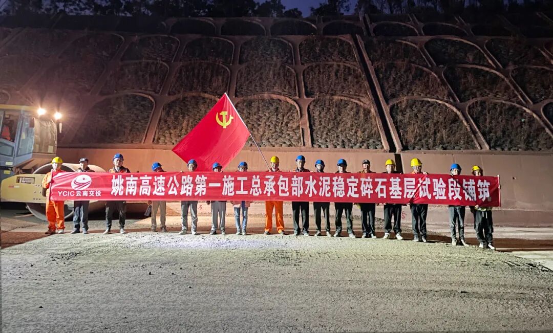 11月11日,姚安至南华高速公路路面项目水泥稳定碎石基层试验段顺利铺筑完成。本次试验段位于项目主线右幅K5+700~K6+000,铺筑长度300米,宽度12米,设计厚度40厘米。