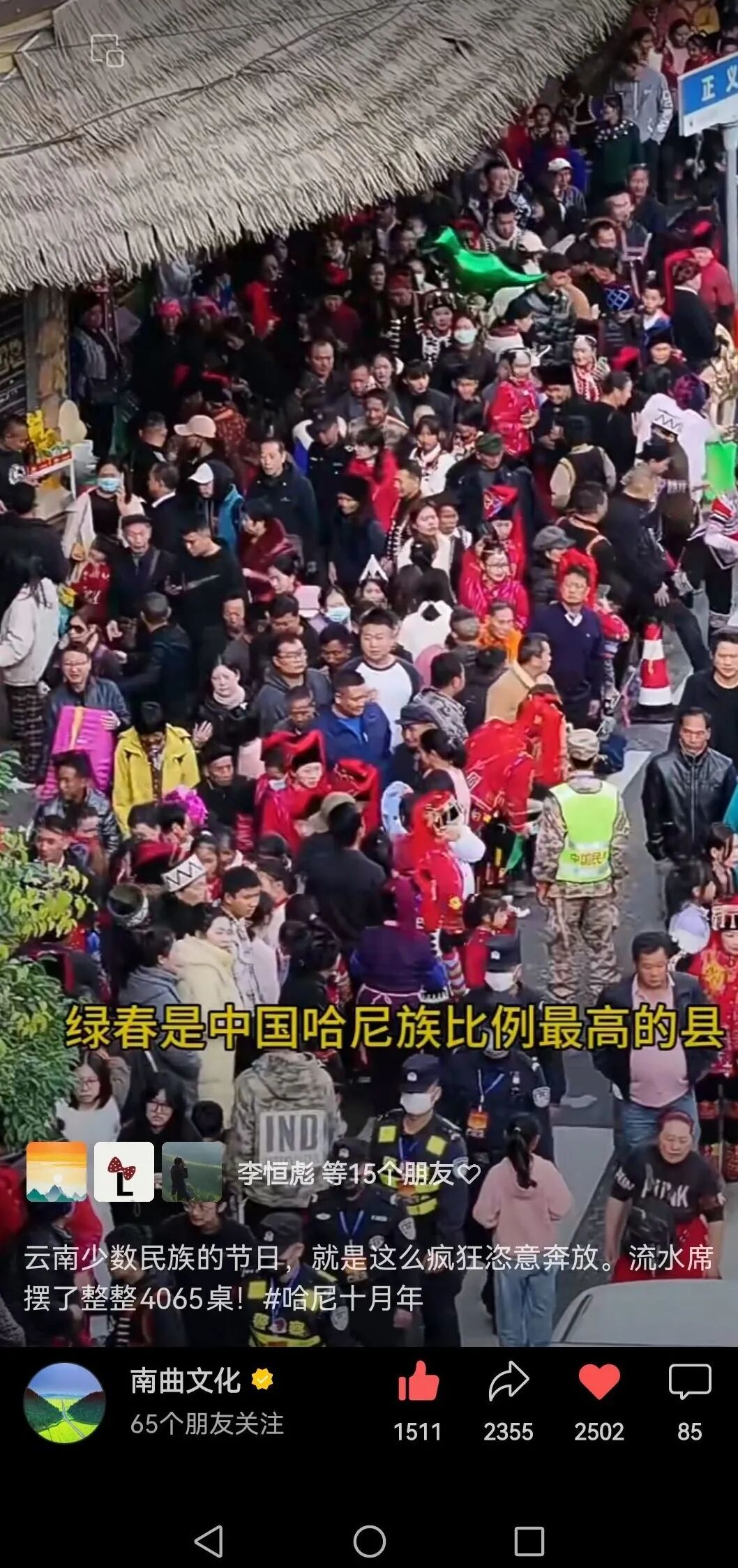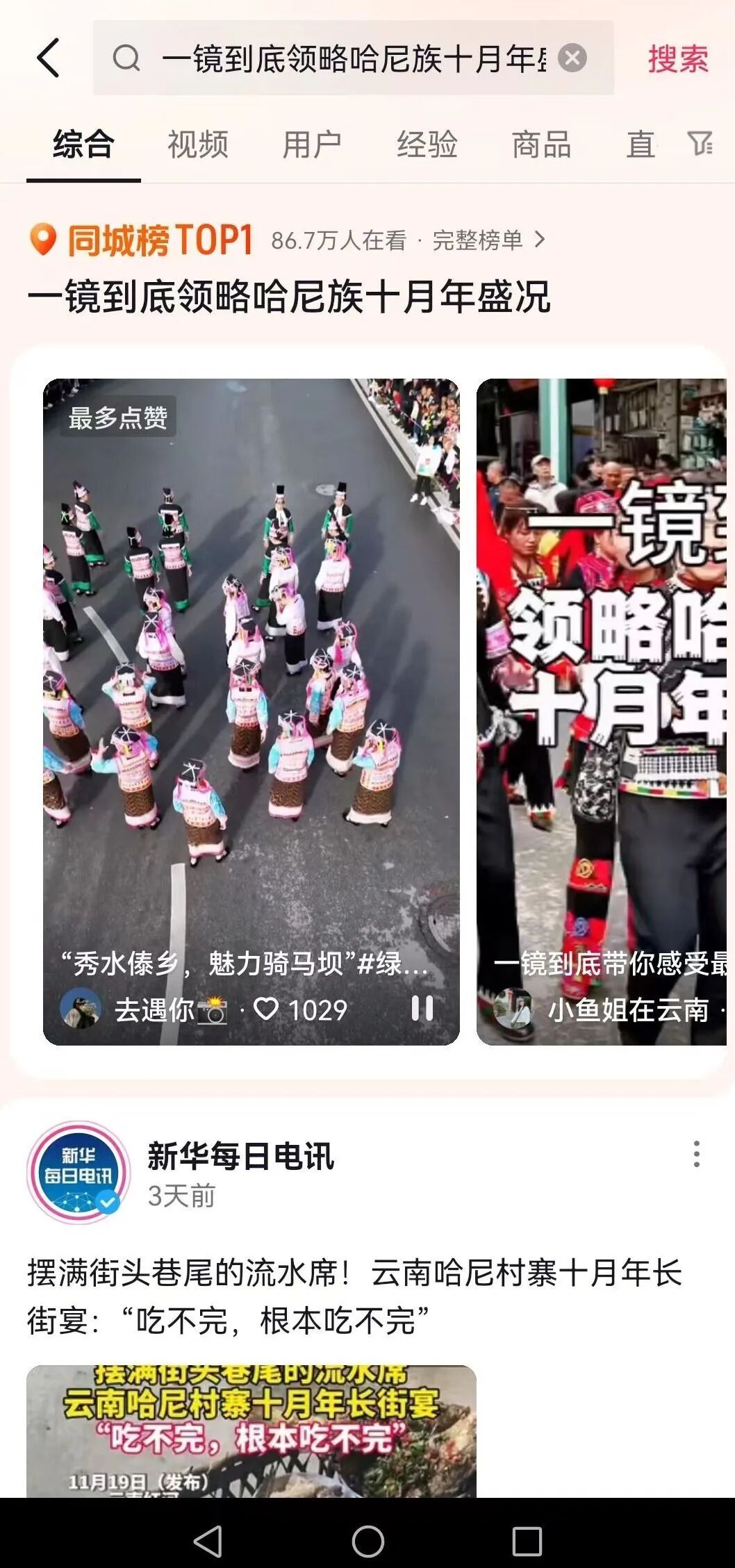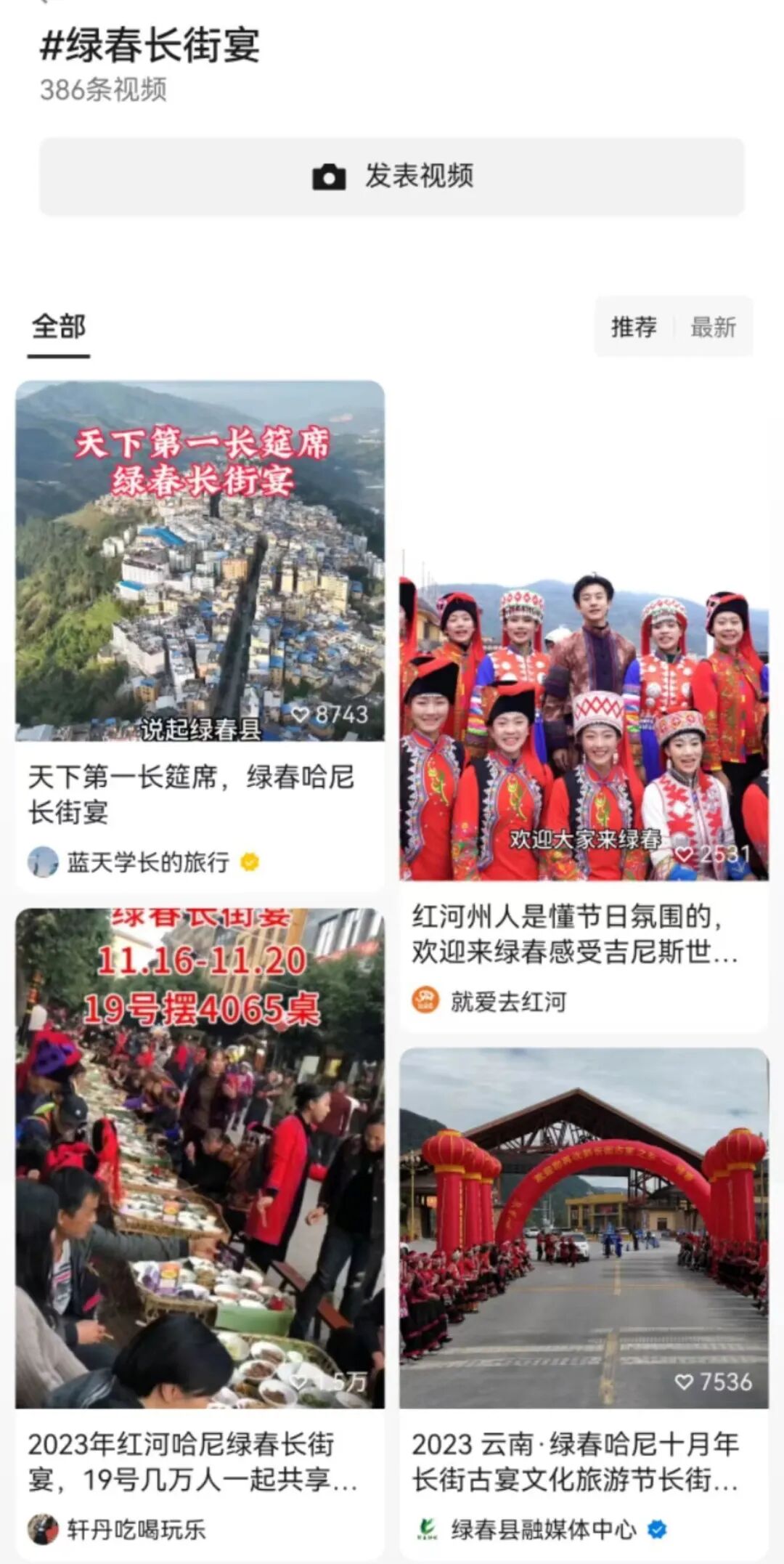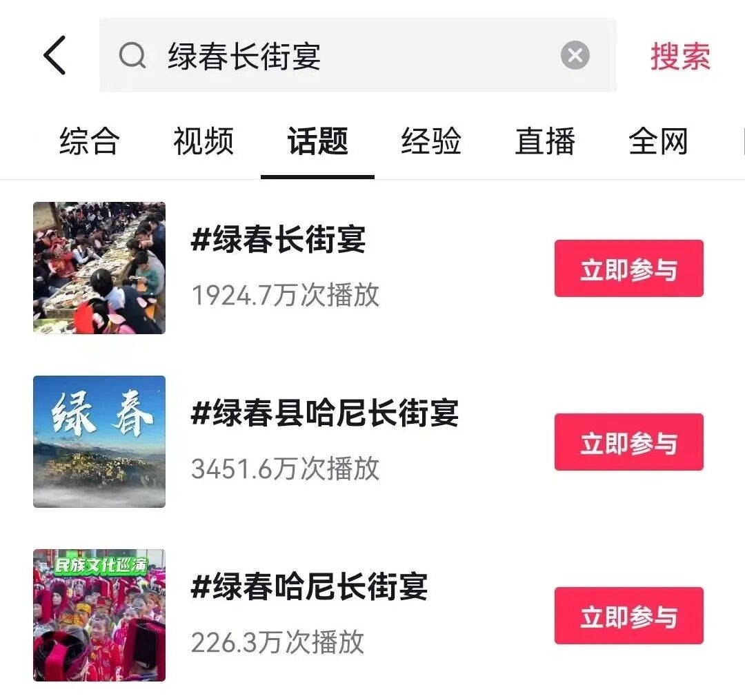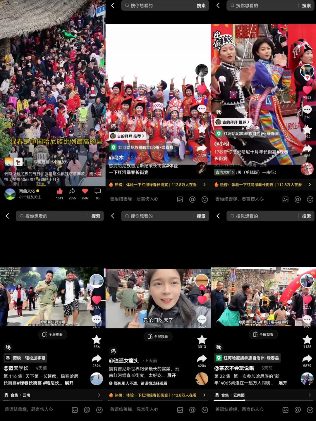 网络达人齐助力,话题宣传创新高。绿春长街宴邀请到@蓝天学长、@鸟木、@小明、@南曲文化、@茶农不会玩说唱、@逍遥女魔头等抖音达人现场助力,他们结合自己的账号属性,从哈尼长街宴的文化、沉浸式体验、民族变装等多种角度进行长、短视频创作10余条,展示数万名本地群众及外来游客齐聚绿春,载歌载舞,充分领略独特的民族文化魅力的热闹景象,也从不同的角度阐释了长街宴的民族文化内涵,让全世界看到了不一样的红河。其中,抖音话题#绿春长街宴 #绿春县哈尼长街宴总播放量达6500W+,互动量为210万+;其中,11月23日上午,话题#一镜到底领略哈尼族十月年盛况抖音传播量达441.6万,上榜抖音同城榜TOP1。