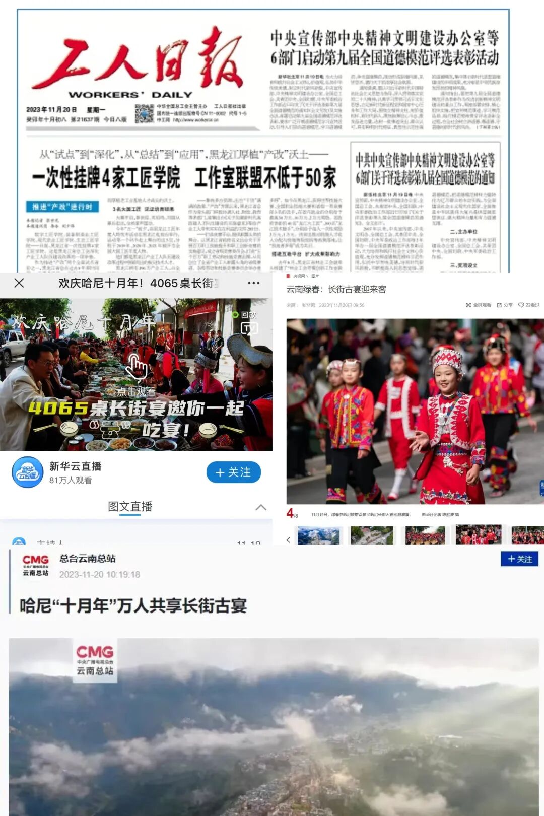 媒体矩阵多方联动,“长街宴”IP火爆出圈。与中央、省级、州级媒体联合互动,充分发挥抖音、微信、微博等新媒体平台作用,按照预热、启动和活动三个阶段,逐步推出绿春长街古宴主宣传片、长街宴美食篇、绿春哈尼文化篇等多个绿春特色短视频,通过网络直播让广大游客和群众沉浸式感受“五洲四海、百兽和鸣、八方宾朋、久归故里、千人满座、万人同席、千人载歌、万人同舞”的云南绿春长街古宴独特魅力,活动观看人次累计达3100W+。开设《绿春春常绿·2023云南·绿春县哈尼十月年长街古宴文化旅游节》专题,阅读量超过458W+,哈尼十月年长街古宴席在网上“火”了起来。