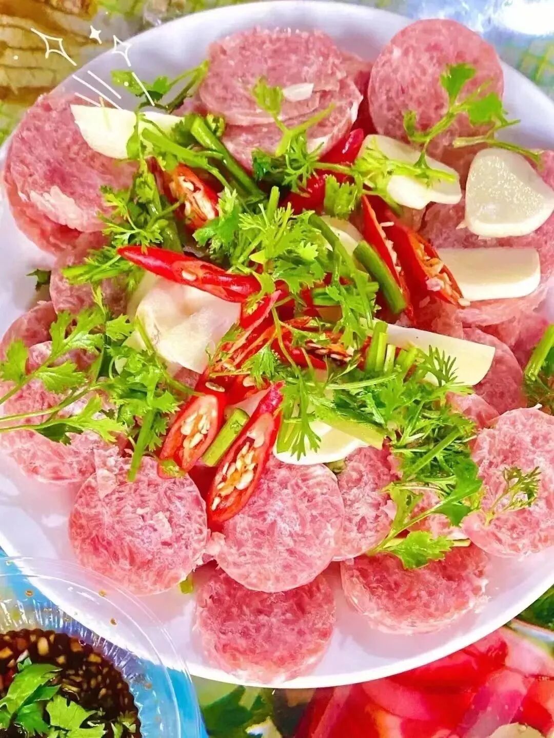 腌制完成的酸肉,颜色粉嫩、味道爽口,对于初次尝试傣族酸肉的食客来时,第一口酸肉就是一次挑战。用酸肉蘸取芥末酱油,搭配新鲜蒜片、小米椒和小芫荽一起入口,让食客一瞬间感受酸、辣、鲜香的刺激三重奏。若实在吃不惯生酸肉的食客,也可将酸肉进行蒸煮或与其他菜一起炒制,感受酸肉独特味道带来的不一样惊喜。