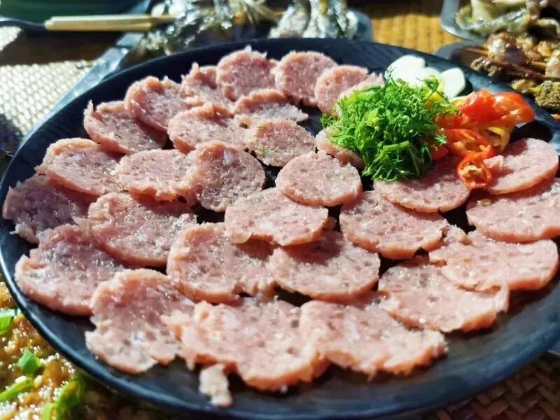傣族酸肉的制作要选用新鲜的猪肉或者牛肉为原料,把选好的肉进行手工剁细,将皮子切条、切丁后将两者进行充分混分,使得肉质口感更加Q弹。在制作过程中放入适量食盐、辣椒、野花椒、蒜瓣等佐料进行调味,再放入少许糯米饭均匀搅拌,装入坛内或竹筒内密封腌制3—5天,让肉呈现出纯正的酸味,便可食用。