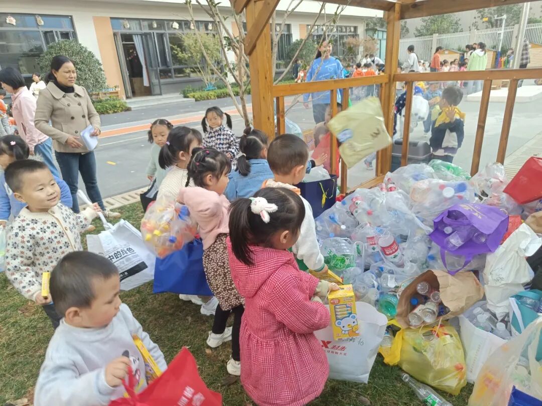 活动开始啦!各班小朋友兴奋地排队,拿着自己收集的瓶子来兑换小礼物,在欢乐的气氛中孩子们感受着环保的意义,在愉悦的情绪中低碳意识也开始萌芽。
