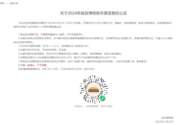 11月27日,故宫博物院发布公告,2024年故宫博物院年票将于2023年12月1日至31日发售,开售时间为12月1日晚20:00。每位观众限购1张,有效期内可入院参观10次。