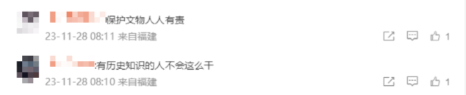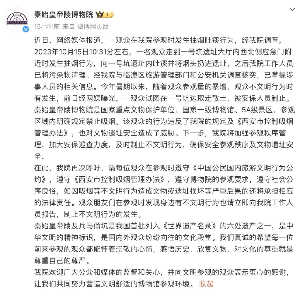 经调查,2023年10月15日10时31分左右,一名观众走到一号坑遗址大厅内西北侧应急门附近时发生抽烟行为,向一号坑遗址内吐痰并将烟头扔进遗址,之后秦始皇帝陵博物院工作人员已将污染物清理。经与临潼区旅游管理部门和公安机关调查核实,已掌握涉事人员的相关信息。