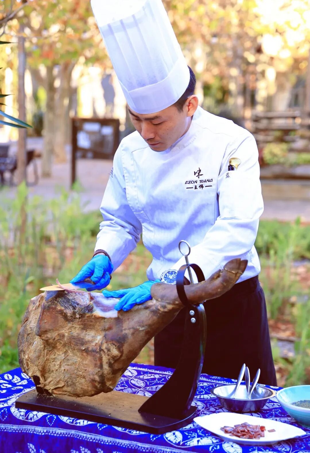 鲜香美味最抚凡人心。傍晚时分,丽江悦榕庄白云餐厅主厨、滇菜国际化倡导者鄢赪大师弟子王伟,为嘉宾们现场制作并派送云南火腿。云南火腿被誉为“用时光雕琢的美味”,一道味觉的历史传承,在王伟刀工细腻的演绎下,一盘盘形似琵琶的云南火腿被送到客人面前,特色的当地火腿细嫩、肉质鲜美,舌尖上的美味旅程随即开启。