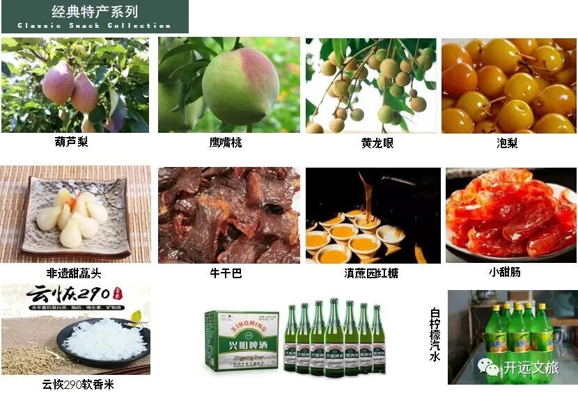 甜藠头、滇蔗园红糖、卧龙米业、西山葫芦梨、小龙潭豆腐皮、红河啤酒、鹰嘴蜜桃、红油香椿、多味瓜子、小龙潭玫瑰酒、隆兰特羊奶、碑格荞粑粑……琳琅满目的开远特色旅游商品,散发着无法复制的迷人风味,都在等你一一品鉴。