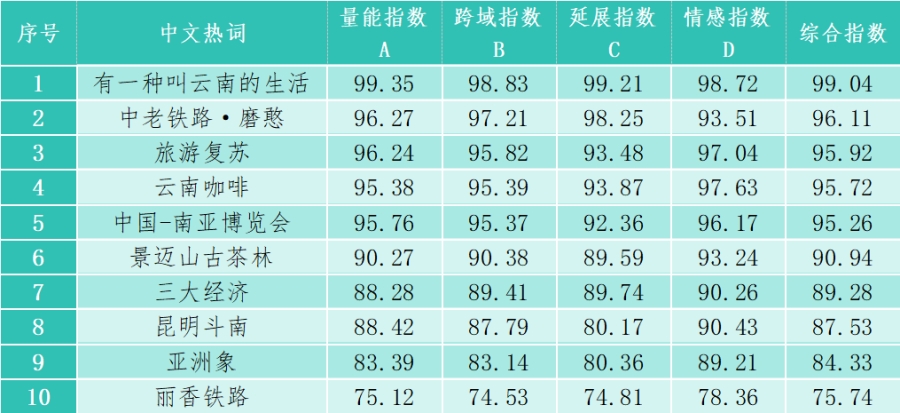其中,“有一种叫云南的生活”“中老铁路·磨憨”“旅游复苏”综合指数位居前三。