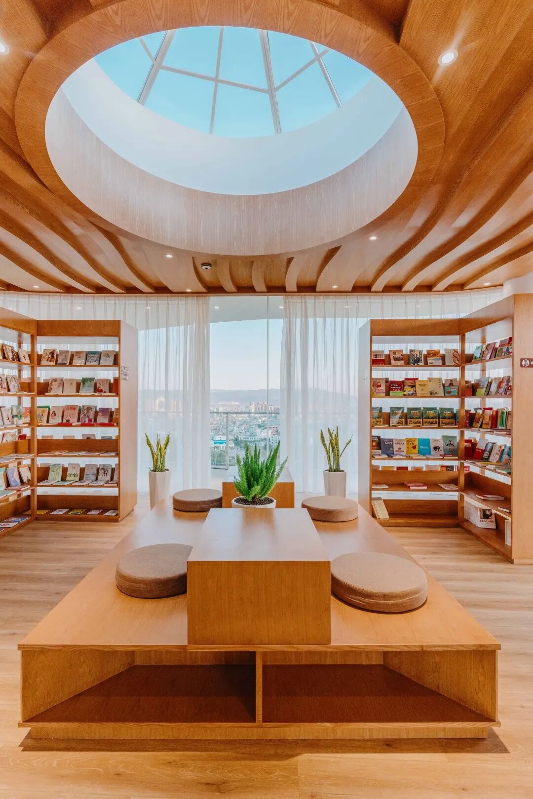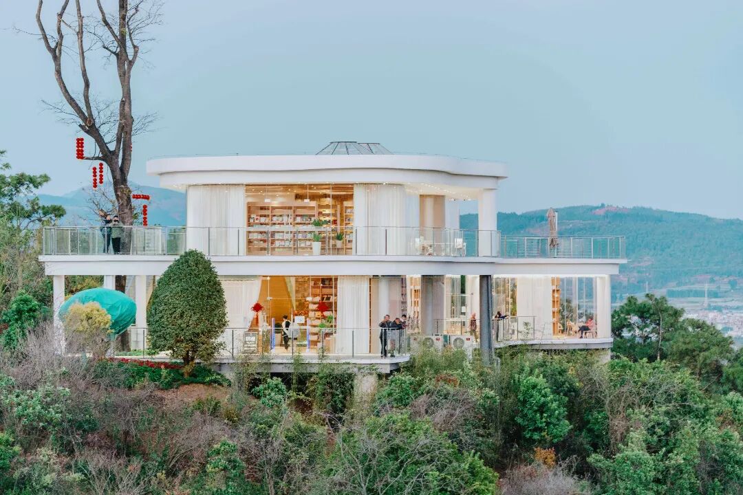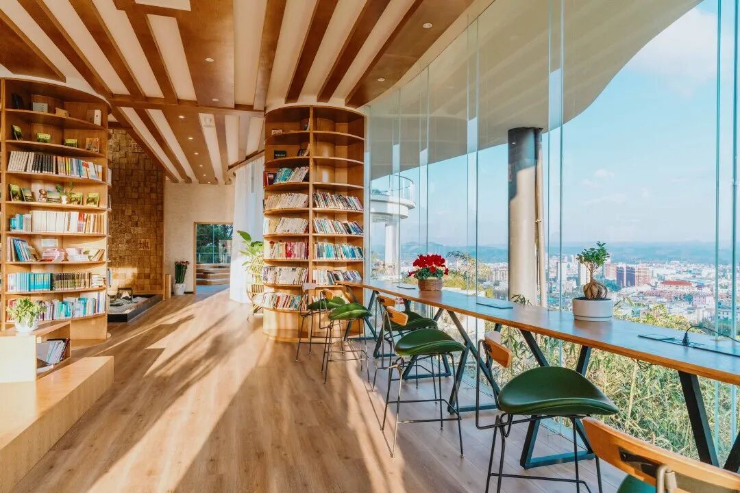 出了天桥后,映入眼帘的别致建筑,就是“书吧”。“书吧”居高临下,远离城市喧嚣,郁郁葱葱的树木是它的背景,微风拂过,树叶沙沙作响。整个“书吧”分为两层,占地面积约2500平方米,可同时容纳100人阅读、休闲。这里拥有上万册图书,各类图书一应俱全,包括热门小说、经典文学、科普传记等,成为游人热捧、追寻的网红打卡地。在山顶,在林间,髯翁森林公园用心打造的这个“书吧”,以“书籍与森林”构建了一座精神居所,让人们在这里停留、小憩,遇见自己。
