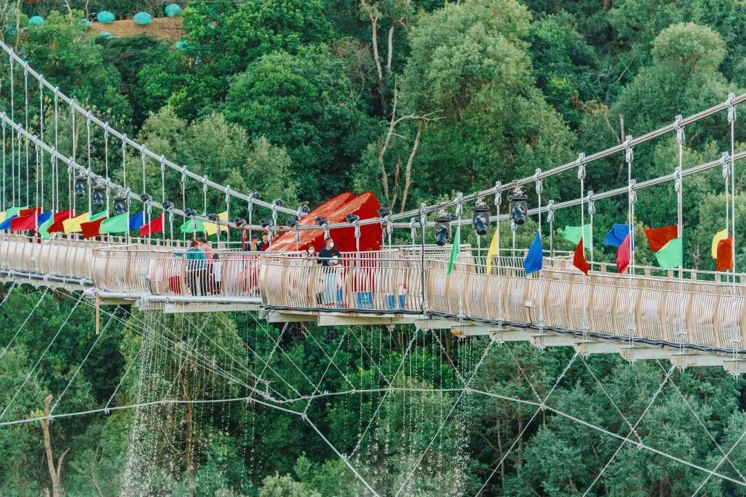 “玻璃水幕天桥”长约220米,最大高度落差99米。天桥充分利用地势条件,连接起两座山体。作为弥勒打造的景观高地,天桥通过景观设施和灯光亮化等,使造型呈“水幕”状,风格与周边环境相协调。