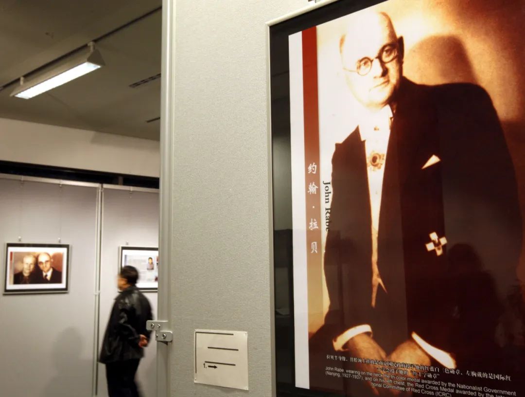 (2010年11月12日,参观者在德国柏林中国文化中心观看约翰·拉贝事迹图片展。新华社记者 罗欢欢 摄)