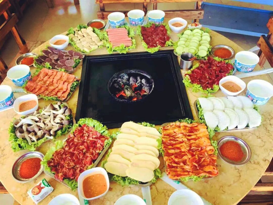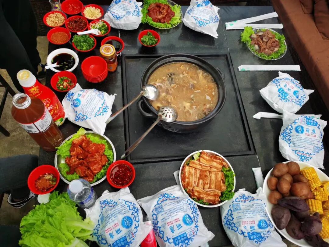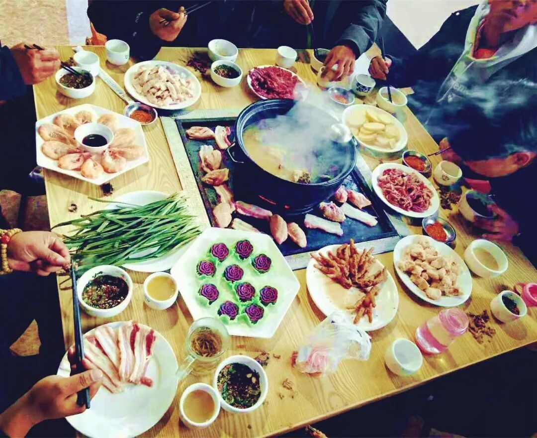 微凉的夜晚,中间炖着鲜美的火锅,四周烤着丽江特产米灌肠、花心土豆、甜脆的玉米以及各式各样新鲜的蔬菜,荤素搭配,味道纯粹而不油腻,喝一口汤吃一块肉,配着特质的蘸料,温暖而惬意。