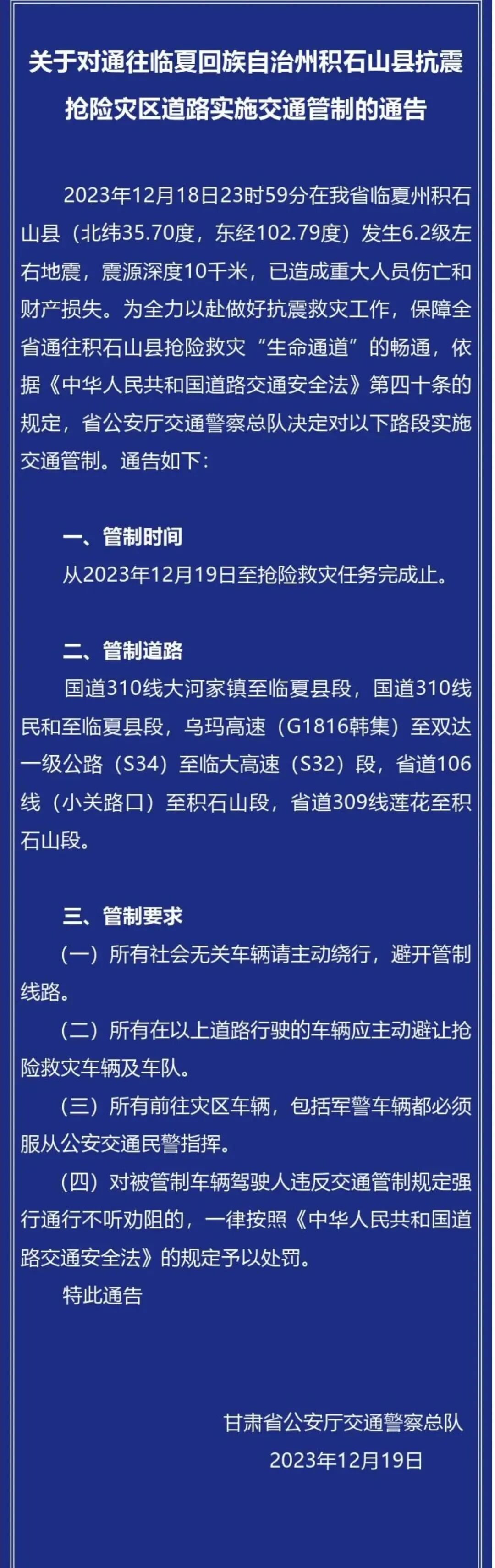 12月19日,甘肃省公安厅交通警察总队发布《关于对通往临夏回族自治州积石山县抗震抢险灾区道路实施交通管制的通告》。