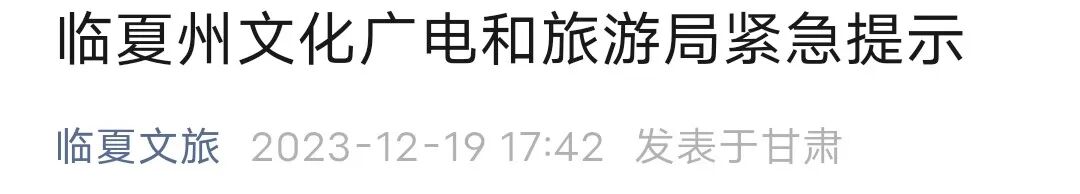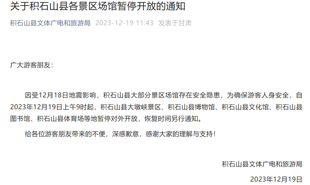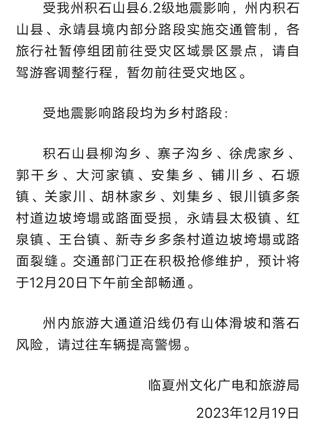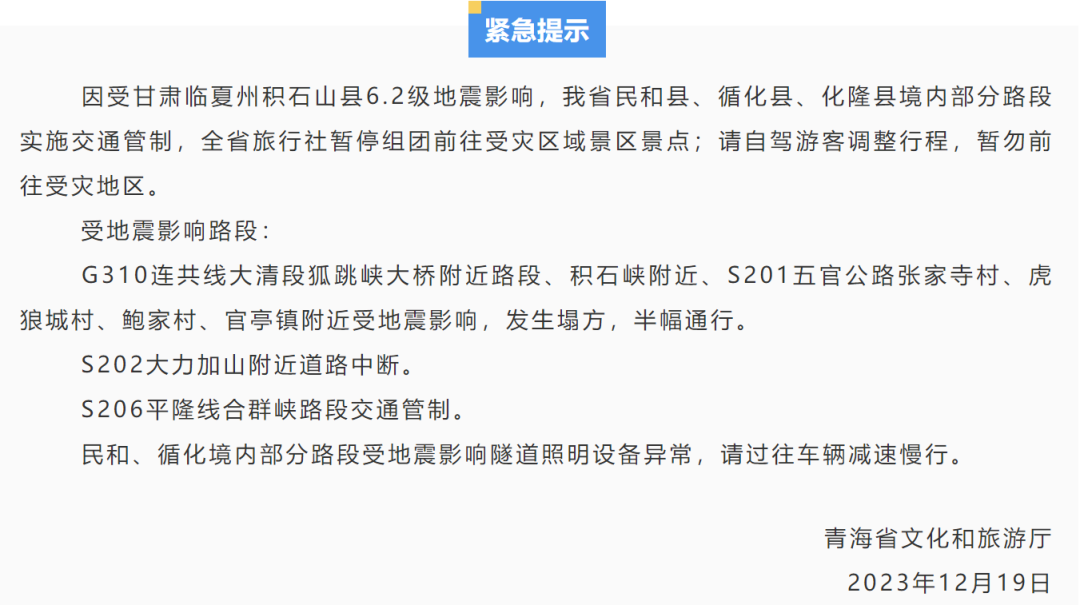 12月19日,临夏州文化广电和旅游局发布紧急提示:受地震影响,积石山县、永靖县境内部分路段实施交通管制,各旅行社暂停组团前往受灾区域景区景点,请自驾游客调整行程,暂勿前往受灾地区。州内旅游大通道沿线仍有山体滑坡和落石风险,请过往车辆提高警惕。