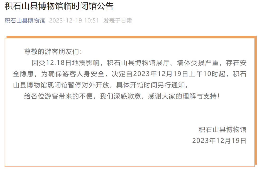 受地震影响,临夏州永靖炳灵寺石窟、积石山大墩峡景区、积石山县博物馆等景区和文化场馆均已暂停对外开放,暂未收到游客受伤或滞留情况报告。