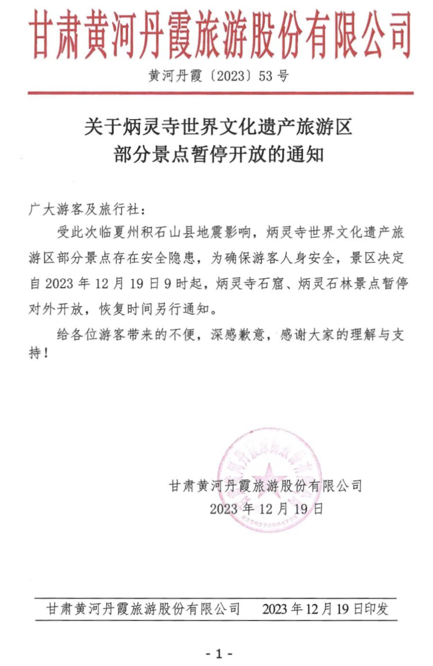 据永靖县文体广电和旅游局透露,受此次地震影响,炳灵寺世界文化遗产旅游区部分景点存在安全隐患,为确保游客人身安全,景区决定自12月19日9时起,炳灵寺石窟、炳灵石林景点暂停对外开放,恢复时间另行通知。