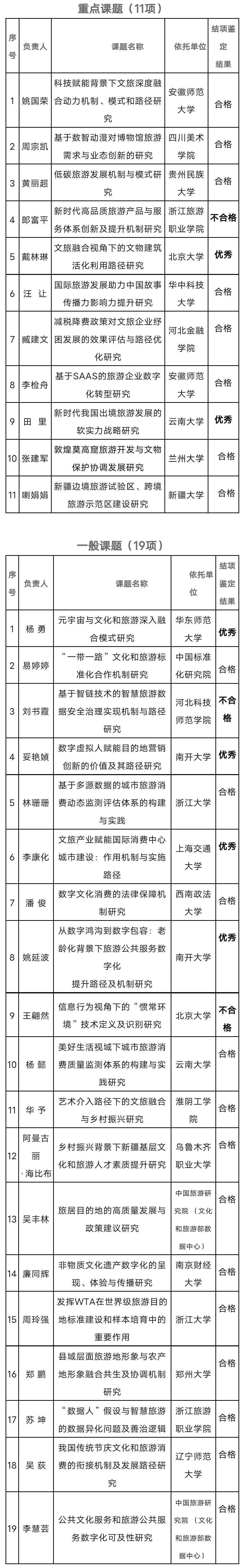 各有关单位:2023年文化和旅游宏观决策课题按程序已完成结项鉴定。经鉴定,6项优秀,21项合格;3项不合格,不予结项。具体结果如下: