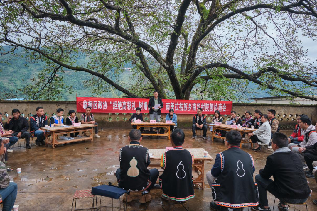 在临翔区南美乡南华村平寨村民活动场所的核桃树下,南华村群众及村(组)干部就“拒绝高彩礼,树婚俗新风”院坝协商议题拉开了话匣子。最终,村民在核桃树下达成了倡导婚俗新风的共识。