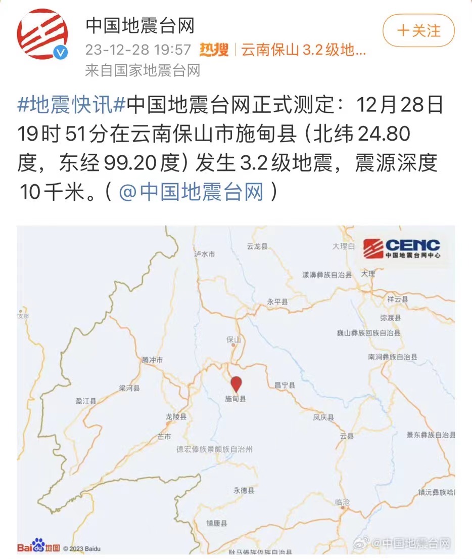 云南保山市施甸县发生3.2级地震 2023-12-28 20:24 中国地震台网 0 中国地震台网正式测定:12月28日19时51分在云南保山市施甸县(北纬24.80度,东经99.20度)发生3.2级地震,震源深度10千米。 来源 中国地震台网官网微博 责编 邓斌 审核 龚怡丹