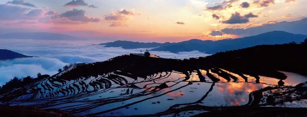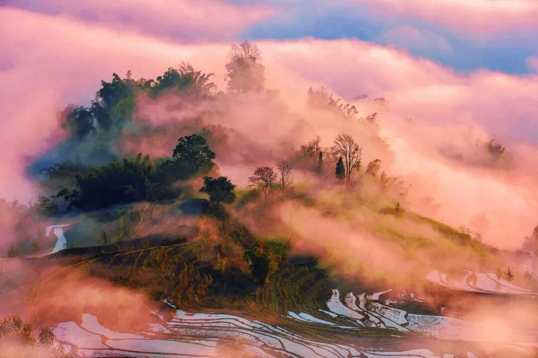 当梯田与云海相会,奔腾的云海与错落有致的梯田相依相偎,一动一静间,变化万千,日出霞红之时,更加奇幻夺目。阳光穿过云雾,晨风吹散白纱,静谧安然的古村寨在缭绕的雾气中逐渐显现,置身其间,宛如人间仙境,轻纱下那波光粼粼、延绵不绝的梯田景观更是让人叹为观止。