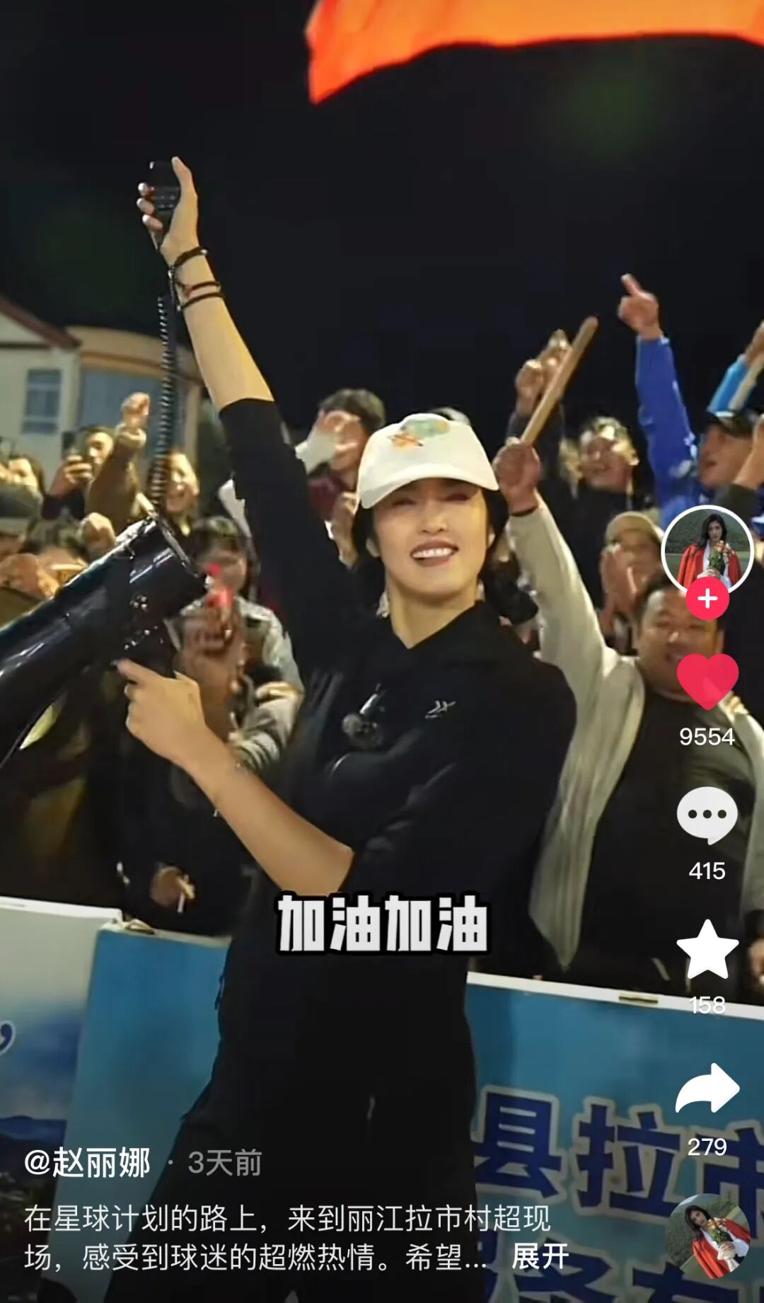 前女足国家队门将赵丽娜现身拉市村超,与球迷互动,为球赛喝彩。(赵丽娜抖音号视频截图)