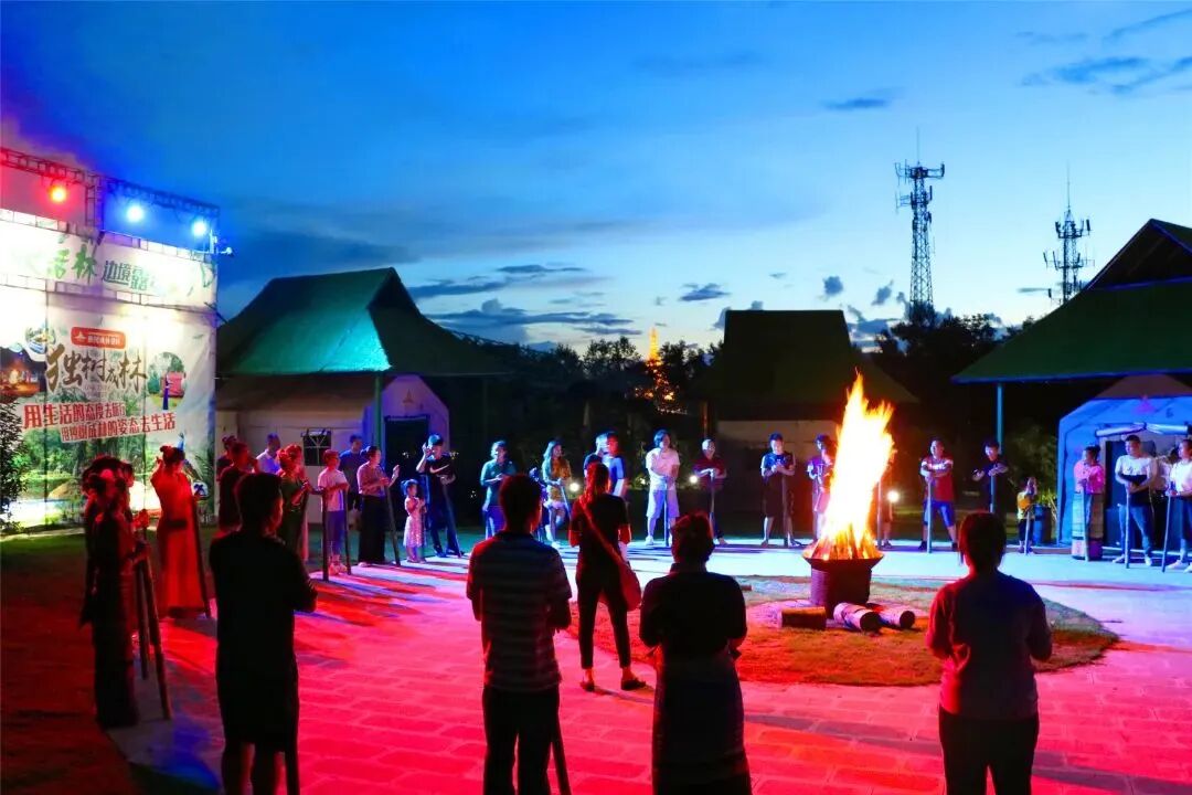 此外,除了欣赏独树成林独特的自然景观外,游客还可以在非遗传承人的讲解、教学中了解象脚鼓的历史文化,在雨林课堂上学习简单的傣族文字,用傣文书写美好和祝福。也可以到独树成林快活林露营基地安营扎寨,在露天泳池拍照打卡、玩水嬉戏,品尝中缅大餐的独特滋味。